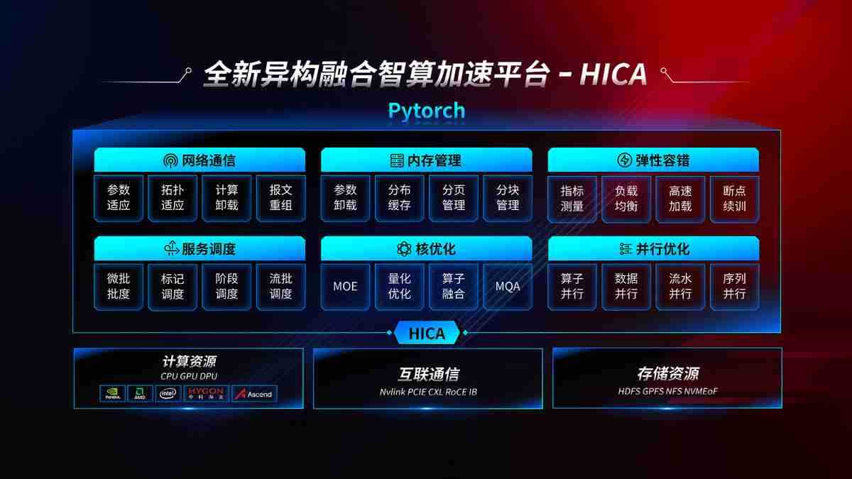 通过自研的服务层、、、中间适配层、、、以及调度编排算法,,采用数据并行、、模型并行等多种并行方式,,,把并行计算任务进行有效的分解,,,使其分别由相应的软件栈和算力资源来承接。。。。当GPU资源变化,,,,HICA可以实时动态调度计算子任务并调整模型拓扑和架构,,以充分聚合各种算力资源。。。。